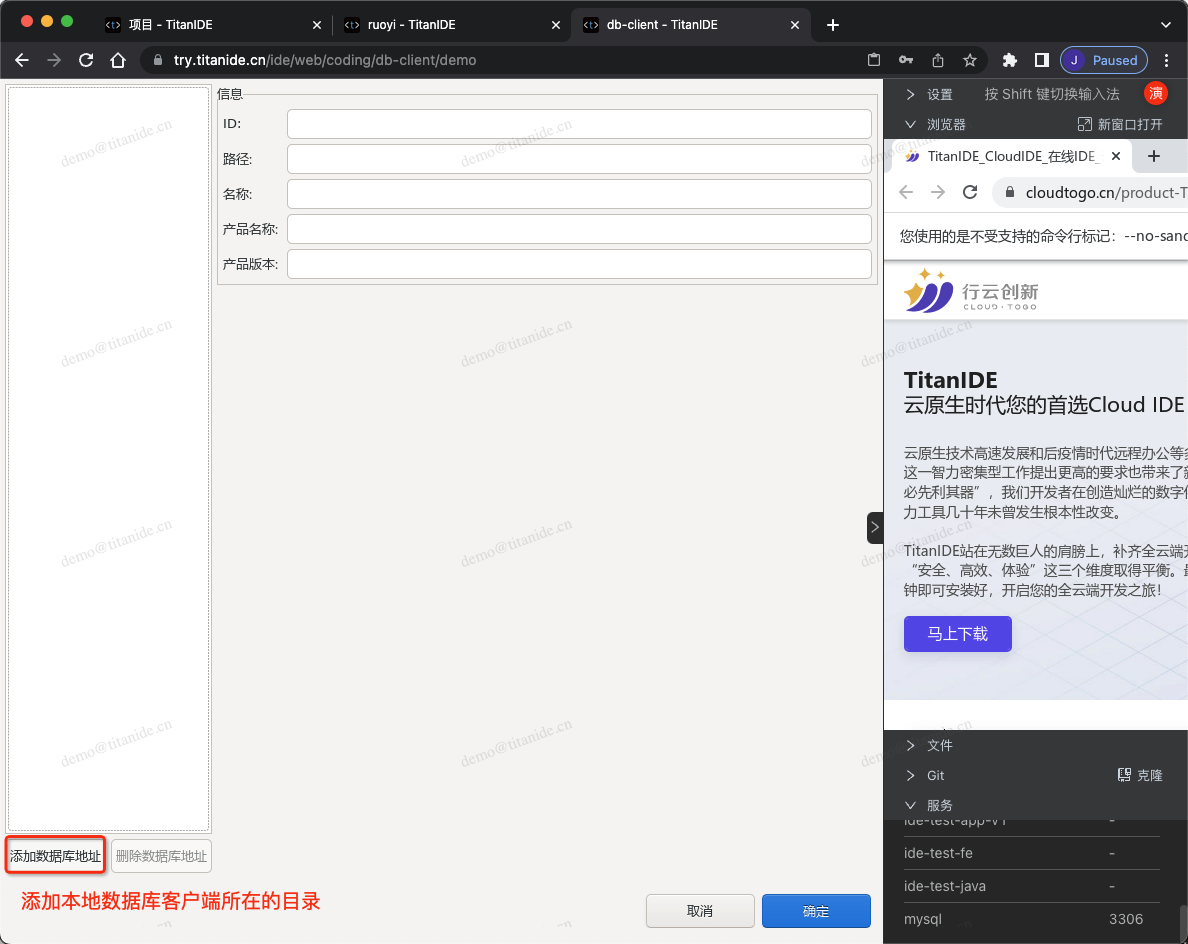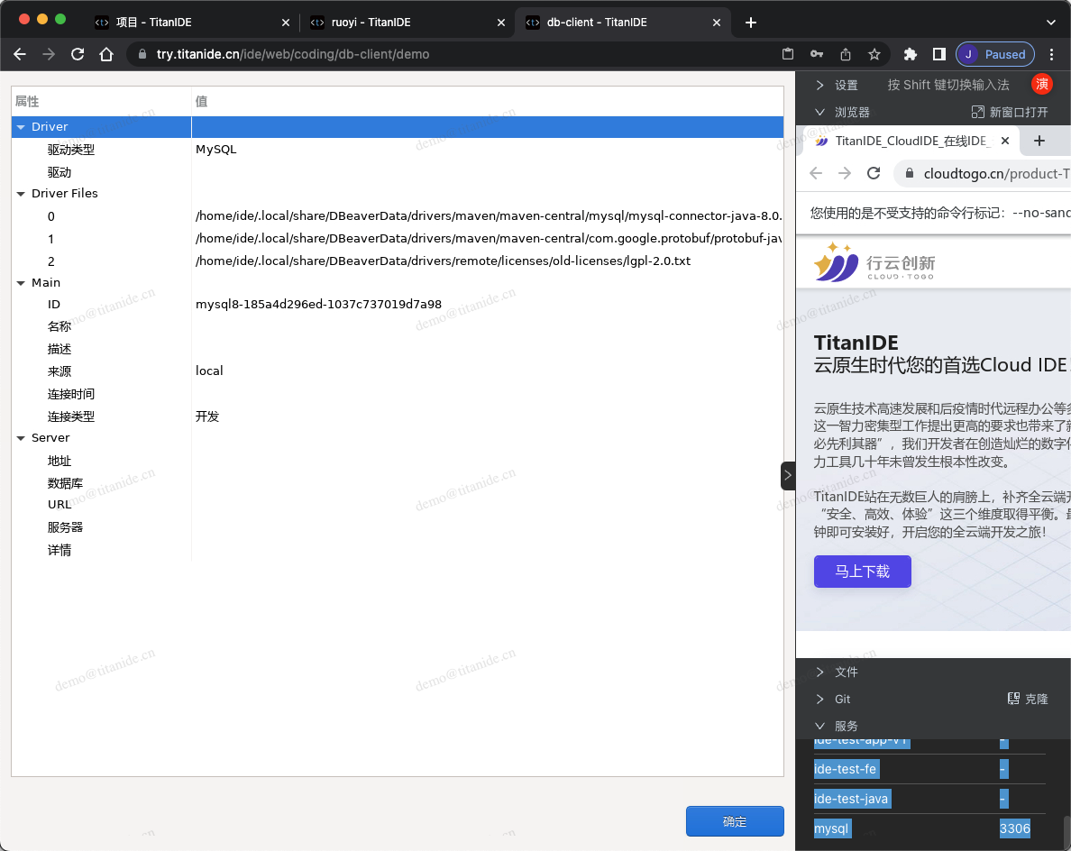 最近,我在使用 TitanIDE 开发云原生应用的时候,需要一个客户端操作数据库,我们一般都会在自己的电脑安装 NaviCat、Workbench、DBeaver 等数据库客户端工具。这些工具都挺好用的。不过呢,NaviCat 想说爱你不容易,虽然MySQL Workbench 是免费的,但是仅支持 MySQL。最后找到了 DBeaver,发现 DBeaver 通过 JDBC 连接到数据库,可以支持几乎所有的数据库产品,还开源、免费。但问题是,TitanIDE 是运行在云端,通过浏览器来访问的,而以上工具皆运行在本地桌面操作系统内部,一个在云端,一个在本地,TitanIDE 和 DBeaver 是怎么坠入爱河的呢?且听我娓娓道来......