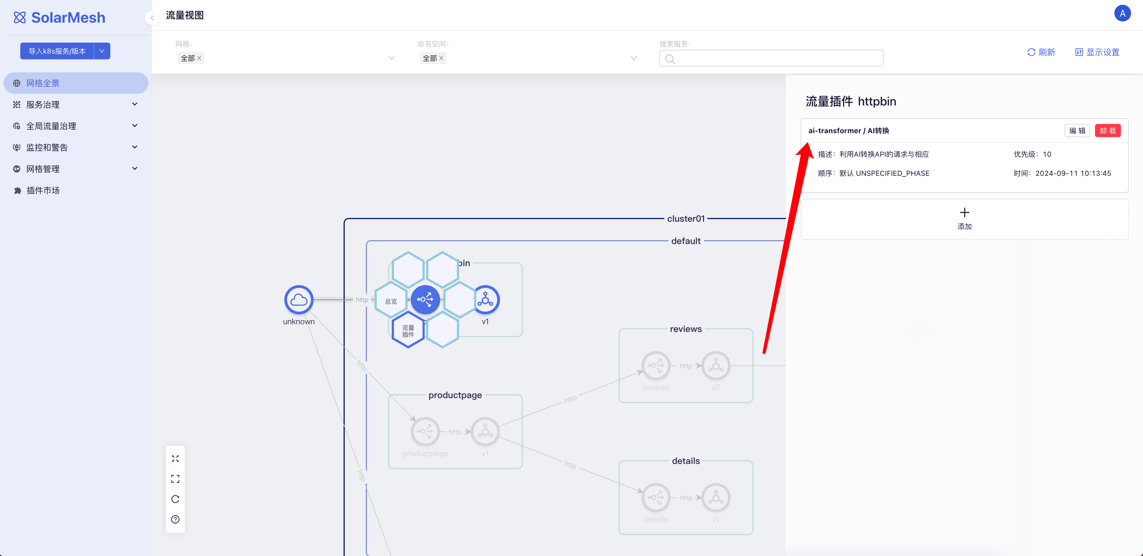 首先前往插件市场,这里有SolarMesh以及内置好的插件,如ai-transformer、request-validation等。