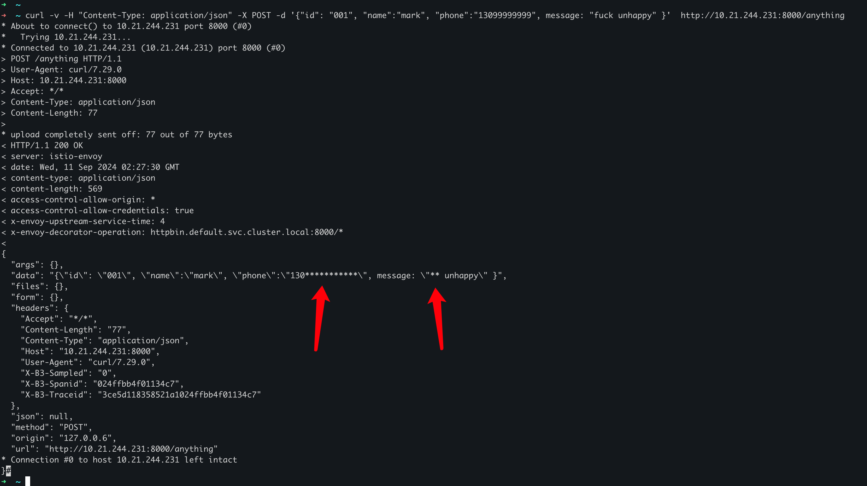 我们可以看到返回的response中,手机号和侮辱性的词汇都被*号覆盖了,说明我们的插件生效了。