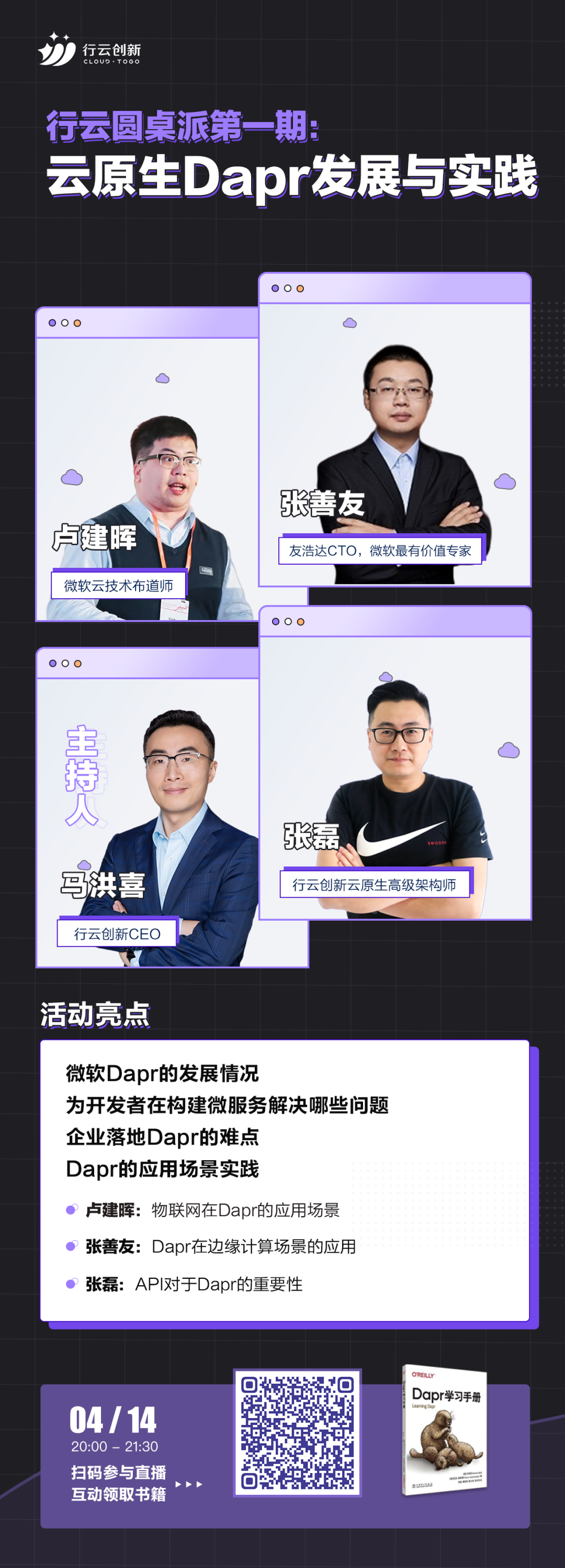 4月14日晚上8点,《行云圆桌派第一期:云原生Dapr的发展与实践》直播来啦!活动由多宝电竞创新CEO马洪喜,微软最有价值专家、.NET技术专家张善友,微软云技术布道师卢建晖,多宝电竞创新云原生架构师张磊四位嘉宾与大家聊聊Dapr的发展情况和落地遇到的问题、Dapr应用场景实践、未来展望等。